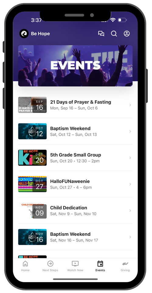 Stay connected with our church community through our app! View upcoming events, RSVP, and add reminders to your calendar.